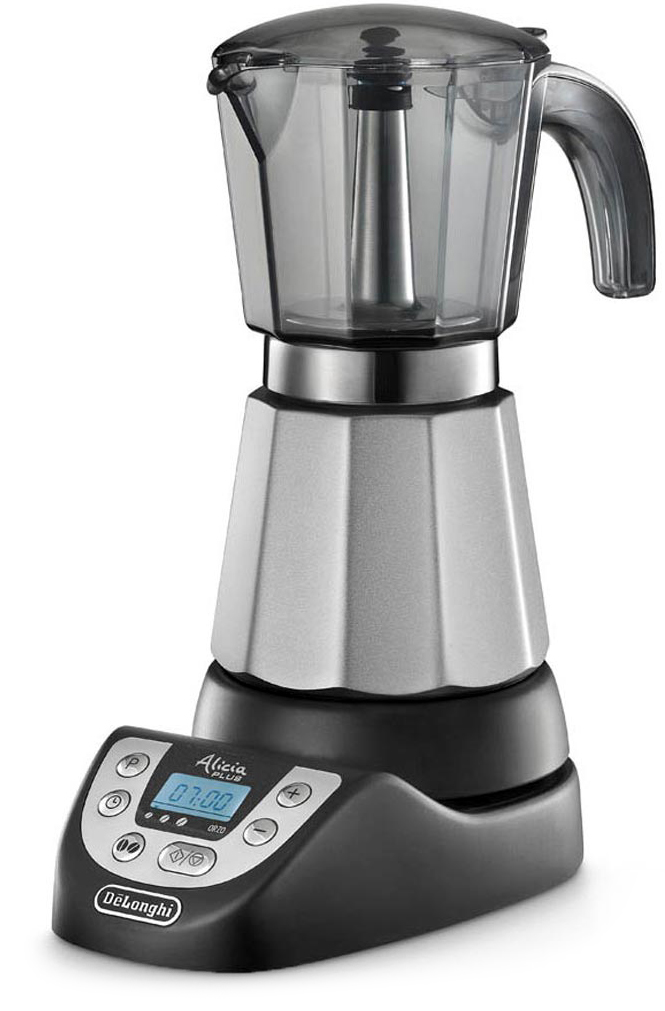The DeLonghi Alicia Plus is an electric moka pot with 6 or 3 cups capacity and digital control. This stovetop espresso maker is equipped with a 24 hour programmable timer: You can program the Moka the day before and you will find your coffee ready when you wake up. You can of course prepare your coffee immediately by using the manual selection.