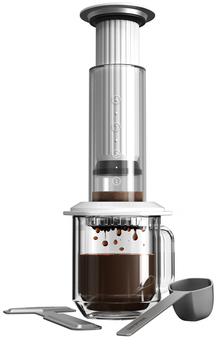 AeroPress Premium kaffebryggeren er fremstillet af håndlavet glas og metal, og den tilbyder en ekstraordinært blød kaffe uden bitterhed - du kan brygge udsøgt kaffe på under 2 minutter!