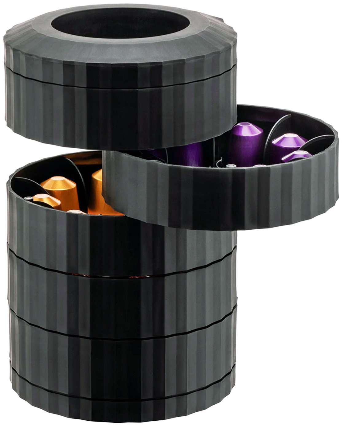 Alessi Plissé kaffekapselholder designet af Michele De Lucchi, har fem roterende hylder lavet af holdbar termoplast og kan rumme op til 40 kaffekapsler, der er kompatible med Nespresso-maskiner.