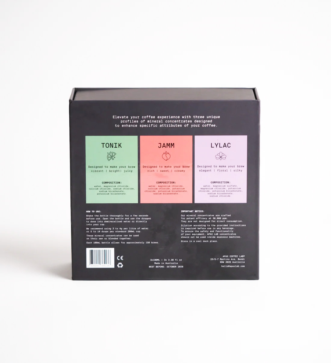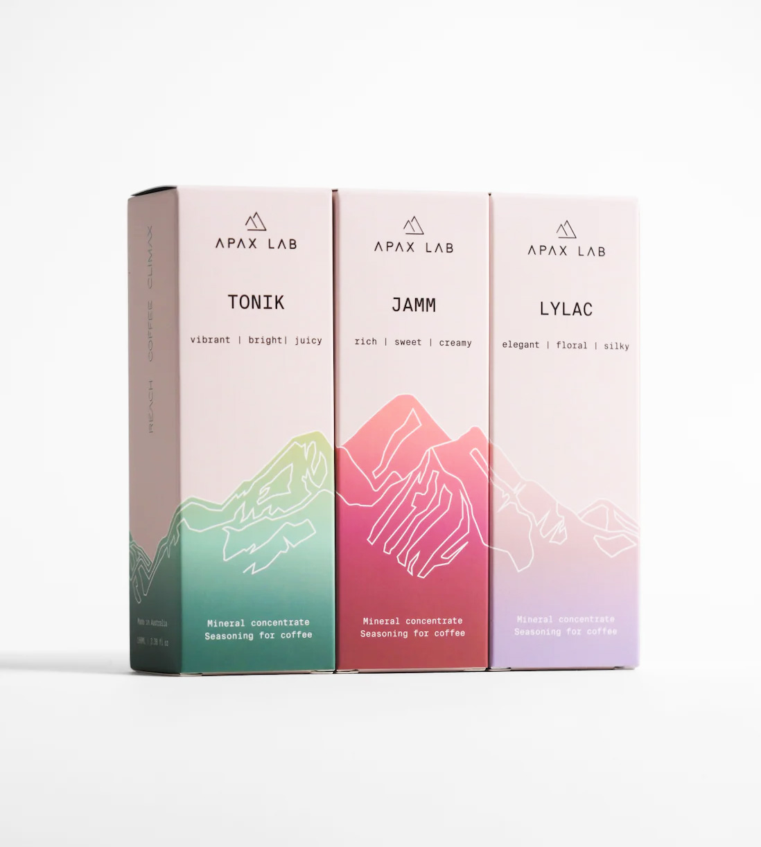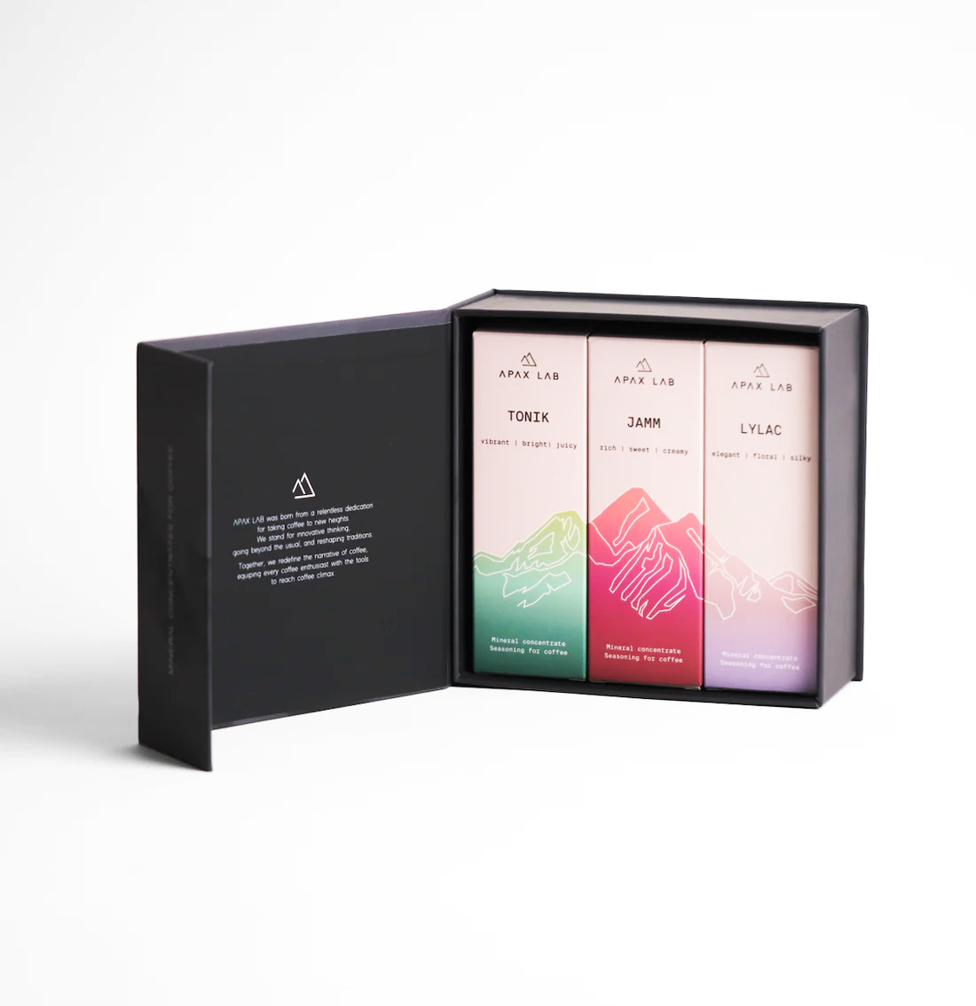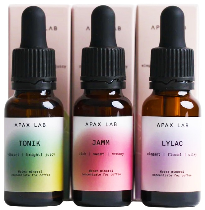 APAX LAB Nano Box Set indeholder alle tre mineralkoncentrater – TONIK, JAMM og LYLAC – og gør det nemt at udforske, hvordan forskellige mineralprofiler påvirker smag, balance og tekstur i kaffe.