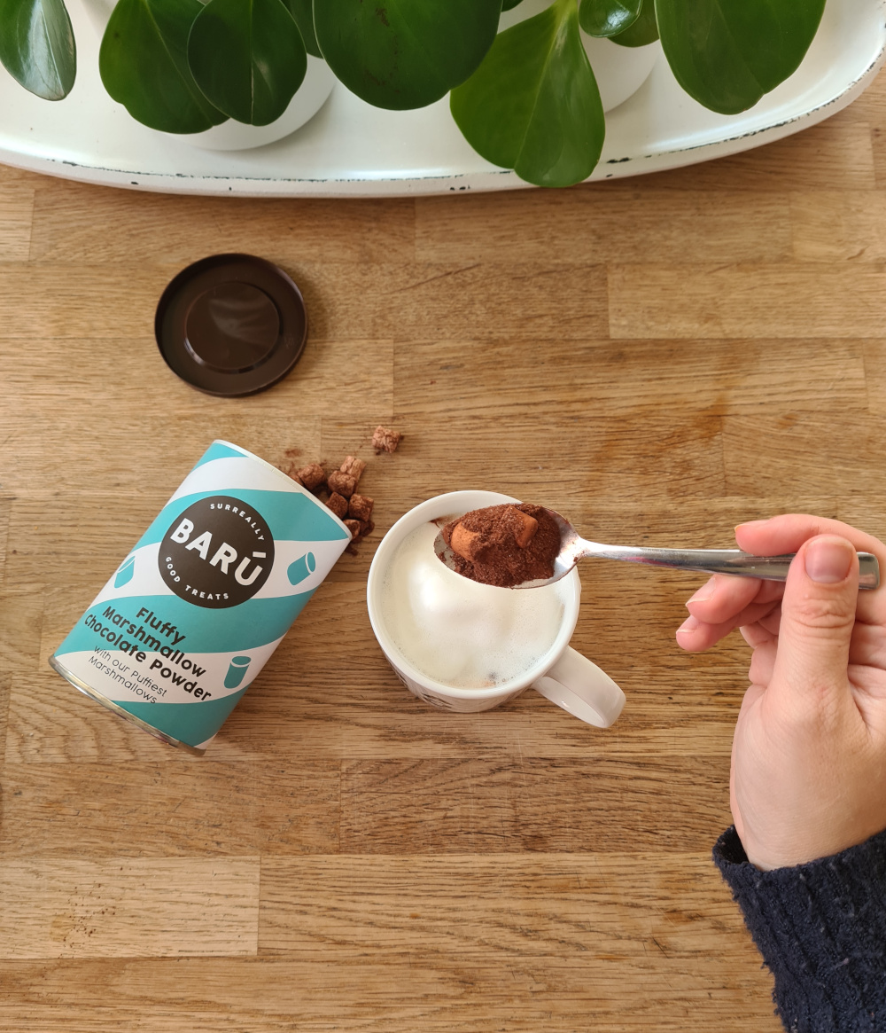 Jeg anbefaler at købe f.eks. Barú Swirly Hot Chocolate kakaodrikpulver og tilføje Barú's egne skumfiduser, som er virkelig bløde og smelter delvist i varm kakao. I denne pakke er skumfiduserne sejere og helt anderledes i typen. Ikke værd at købe. Det er bedre at lave det selv, så man også kan bestemme mængden af skumfiduser.
