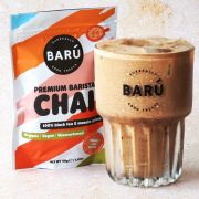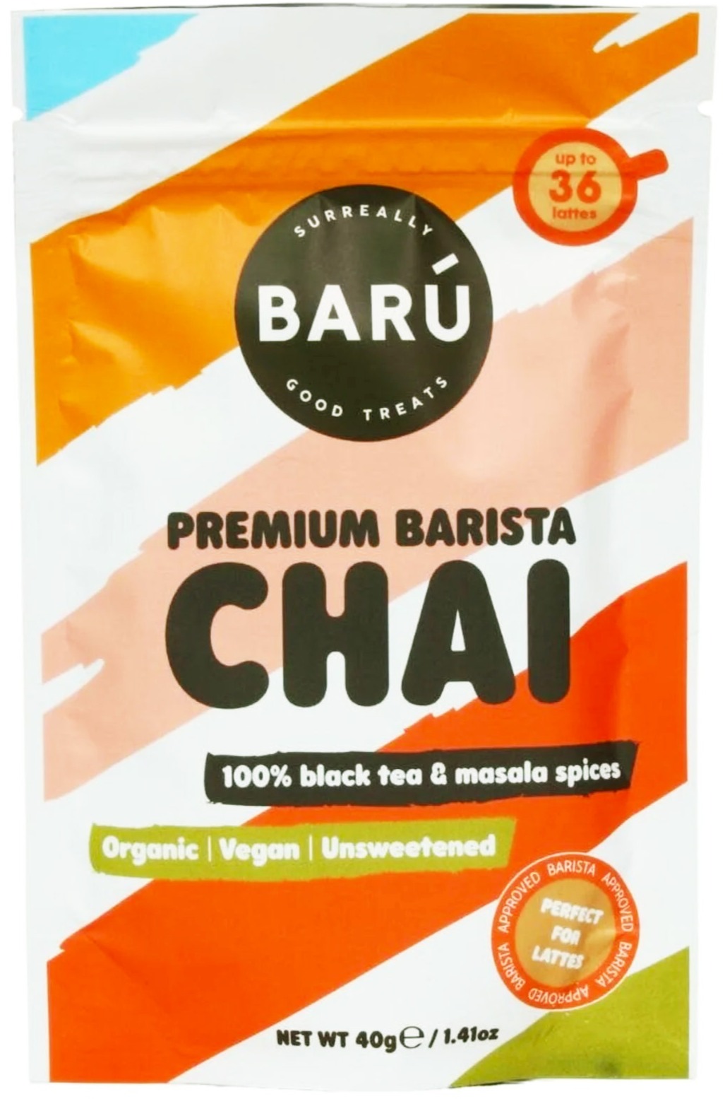 Barú Premium Barista Chai – en chai latte-mix lavet med sort te og traditionelle masala-krydderier som kanel, ingefær og kardemomme. Fremstillet af 100 % økologiske ingredienser og uden tilsat sukker.
