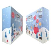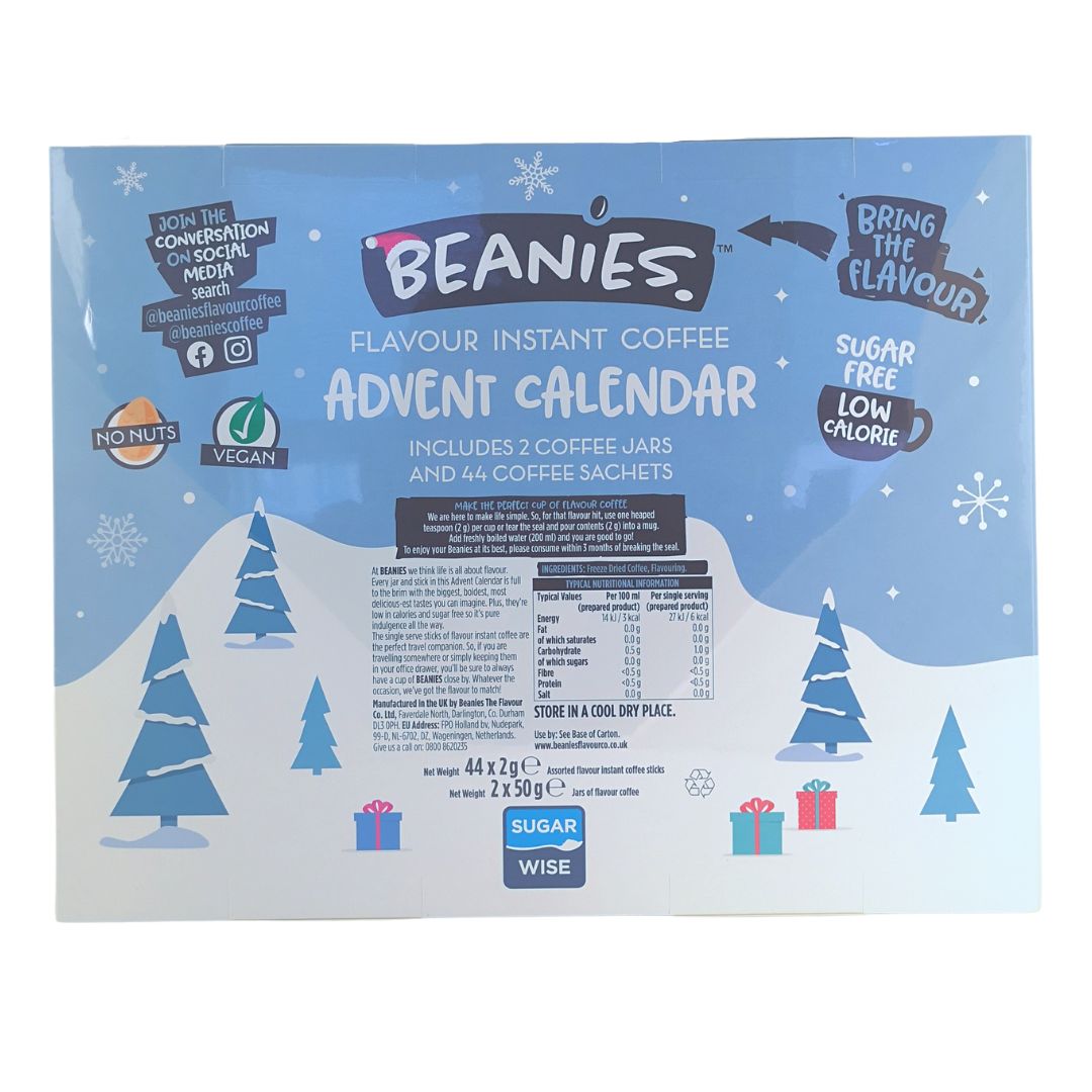 Beanies julekalender 2025 har 24 låger at åbne, du finder forskellige Beanies portionspakker bag hver låge OG 2 x 50 g overraskende dåser med Beanies smagskaffe!