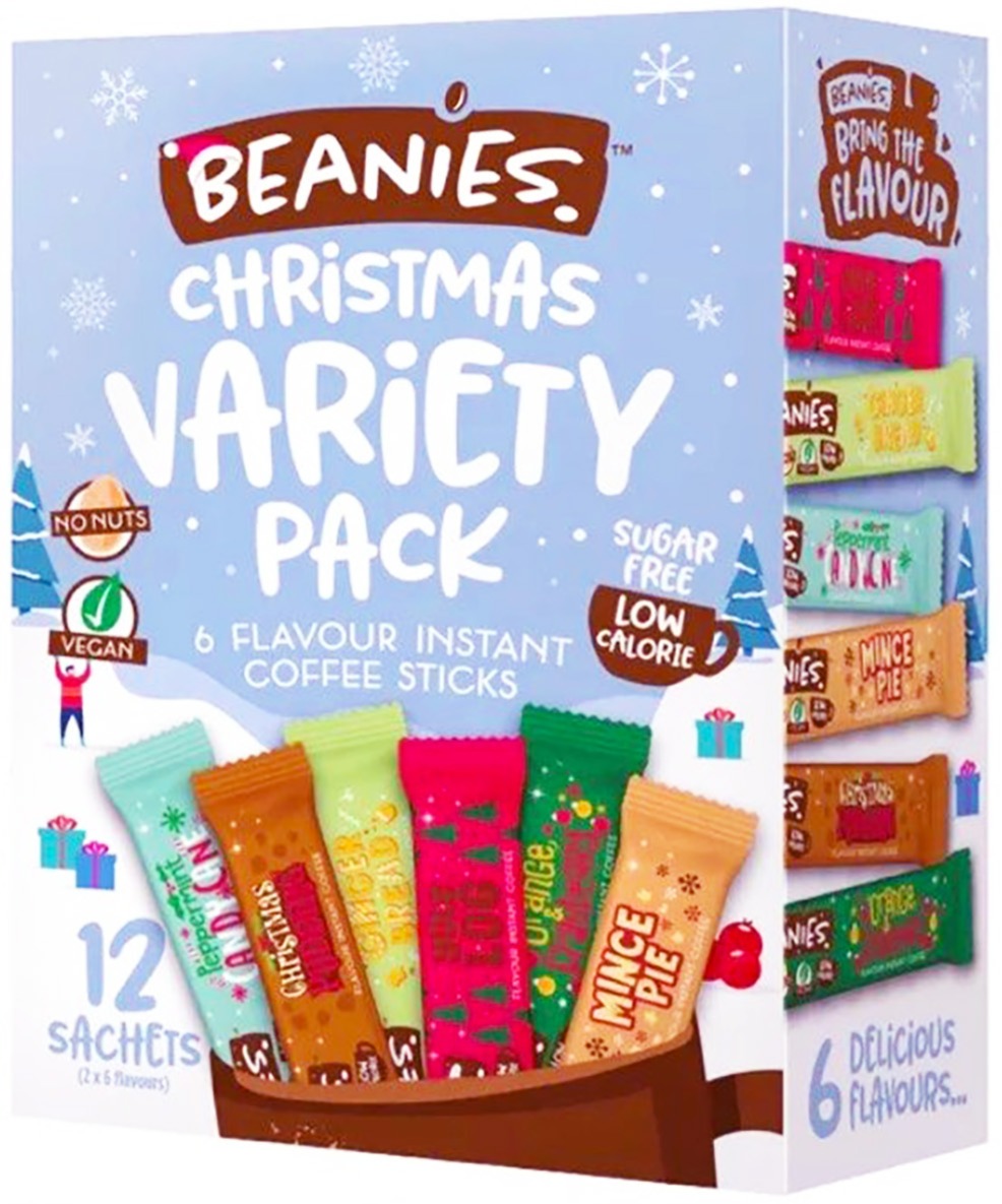 Beanies Christmas Variety Pack indeholder et udvalg af juleagtige instantkaffer - 12 praktiske portionsposer, der er lette at tage med!