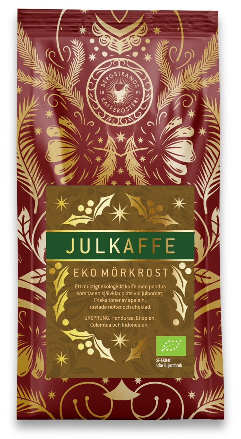 Bergstrands økologiske og mørkristede julekaffe er skabt med omhyggeligt udvalgte bønner fra Honduras, beriget med smagfulde elementer fra Etiopien, Colombia og Indonesien. Den mørke ristning giver kaffen en imponerende tyngde og gør den til en selvfølgelig gæst ved julebordet, lige som saften!