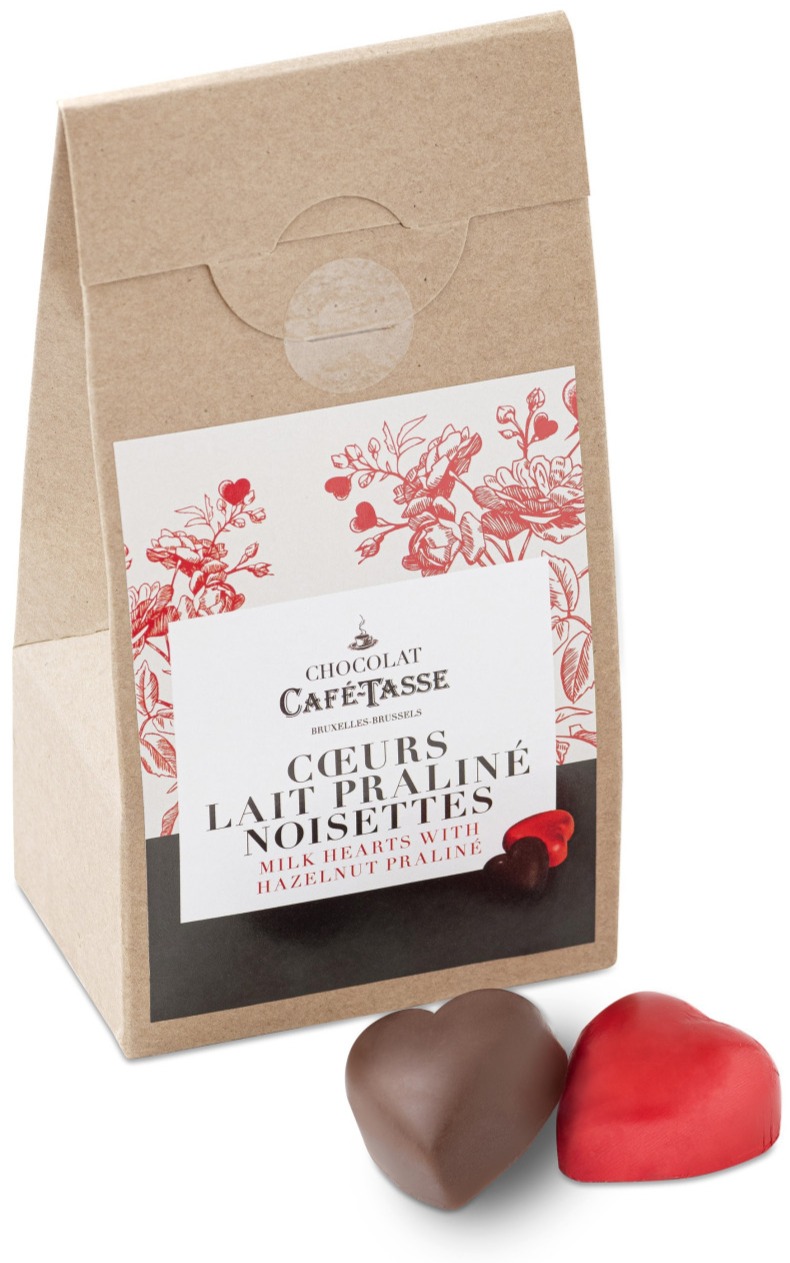 Emballagen indeholder 10 mælkechokoladehjerter (38% kakao) fyldt med herlig hasselnødpraliné med en fin nøddeagtig sprødhed.