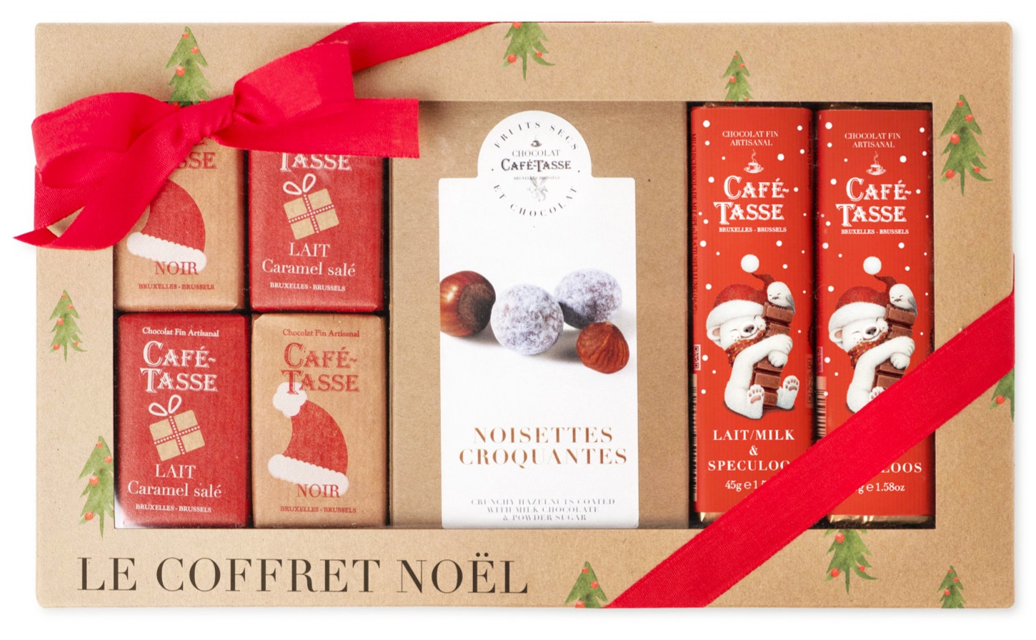 Fejr sæsonen med denne festlige gaveæske fra Café-Tasse, perfekt for chokoladeelskere. Indeni finder du et udvalg af vidunderlige lækkerier: