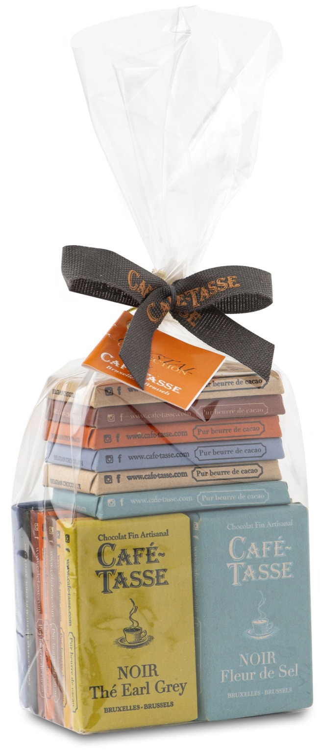 En pose med 20 belgiske Café-Tasse mini-chokoladestykker i 9 forskellige smagsvarianter, mørk, mælk og hvid - perfekt til at dele med venner og familie.