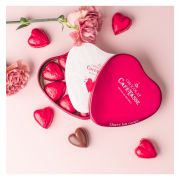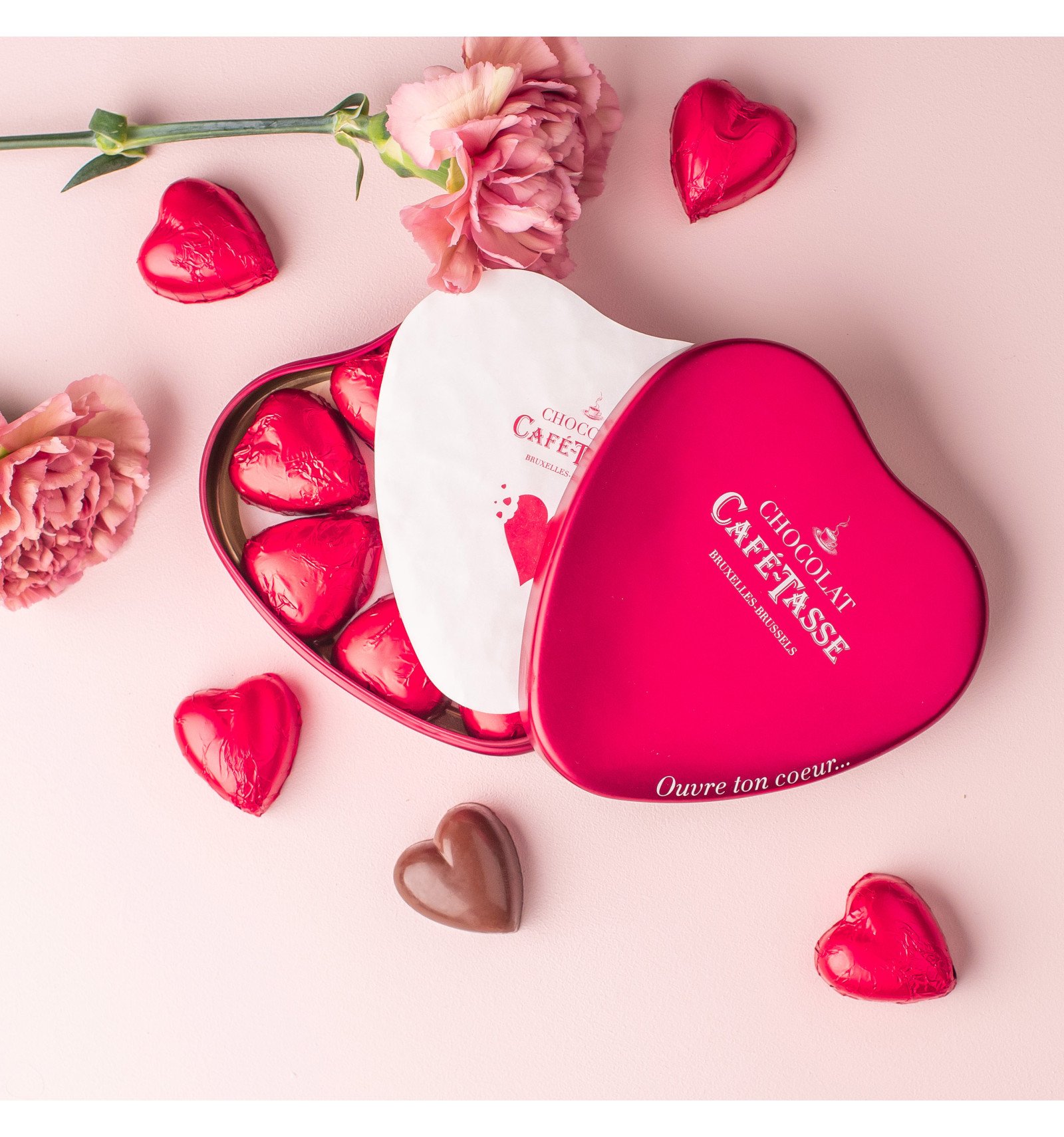 Sød hjerteformet metaldåse med inskriptionen “Ouvre ton cœur”, indeholdende 9 mælkechokoladehjerter (38% kakao) fyldt med hasselnødpraliné. Den bløde pralinefyldning og den nøddeagtige sprødhed gør denne håndværkschokolade til en rigtig delikatesse.