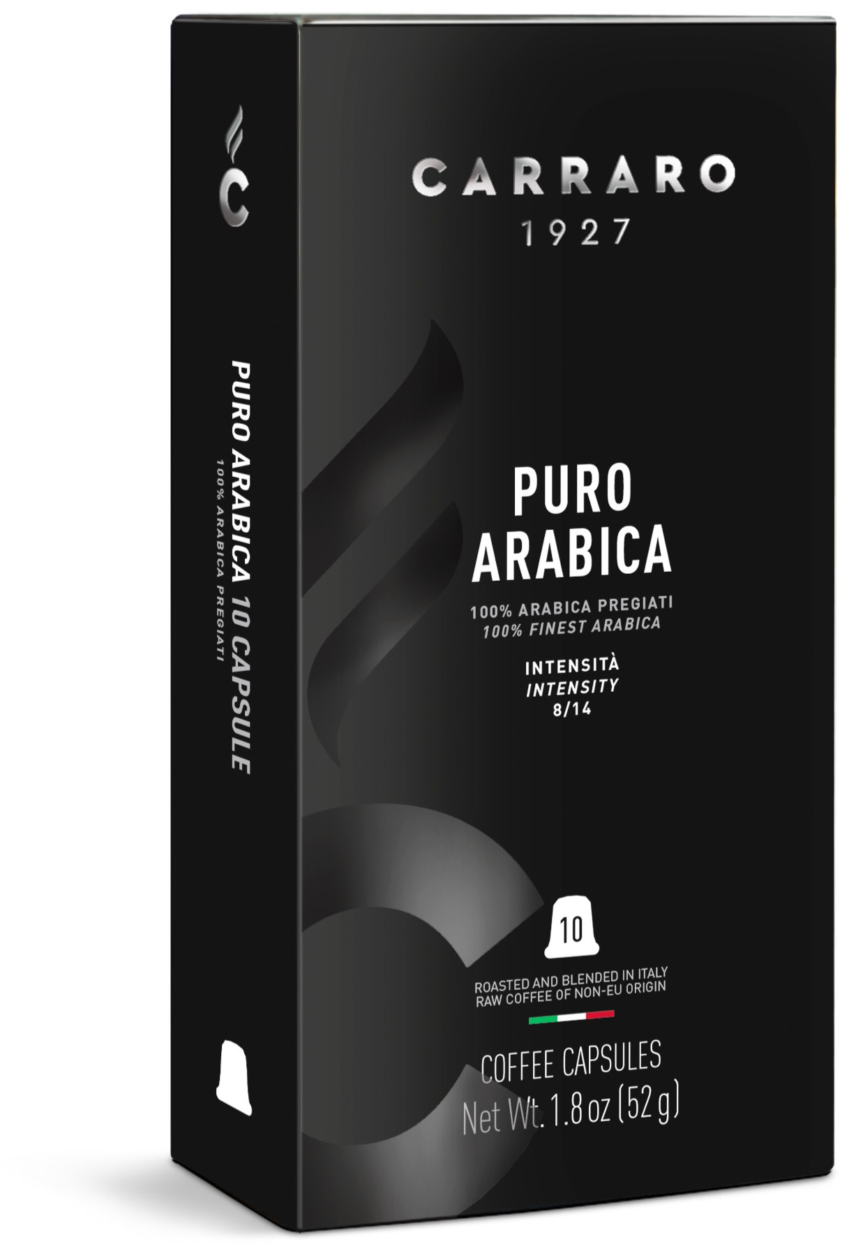 Carraro 1927 Puro Arabica Nespresso-kompatible kaffekapsler indeholder otte udvalgte varieteter af Arabica-kaffe. Indslag af jasmin og rosenblade findes i kaffens duftende, blomstrende aroma, mens smagen er fyldig, med fremtrædende søde noter. Kaffen har en lang, delikat eftersmag.