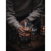 #1Chemex-kaffebryggeren er en enkel og flot måde at brygge og servere kaffe på! I Chemex bruges filterpapir, der er tykkere end normalt. Den langsommere bryggeproces giver vandet mere tid til at udtrække alle de gode aromaer fra kaffebønnerne, og samtidig forhindrer det de mindste partikler i at ende i det bryggede kaffe. Du får et fyldigt, klart resultat.