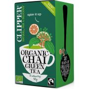Let og forfriskende Clipper Organic Chai Green Tea - grøn te med traditionelle indiske Chai te krydderier; opvarmende kanel, kardemomme og kryddernellike. Den grønne te dyrkes på økologiske Fairtrade-gårde i Indien og Kina. Teen blandes og pakkes på Clippers te-fabrik i sydlige England.