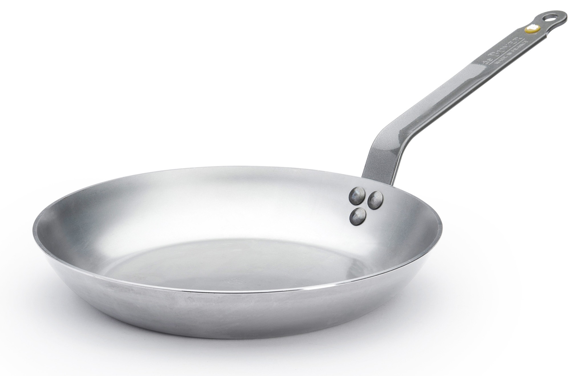 de Buyers stålpanner har været produceret i den samme fabrik i Frankrig siden 1830. Stålpanden er den traditionelle franske stegepande, der kan tåle høj varme, og dens kant er relativt høj og afrundet for at man kan ryste den uden at maden falder ud. Håndtaget i støbejern er fladt, så man kan aflaste håndleddet ved at støtte håndtaget mod underarmen. Håndtaget bliver ikke varmt ved normal brug, men hvis pannen holdes varm over længere tid, skal man bruge en grydelap eller en håndtagsbeskytter.