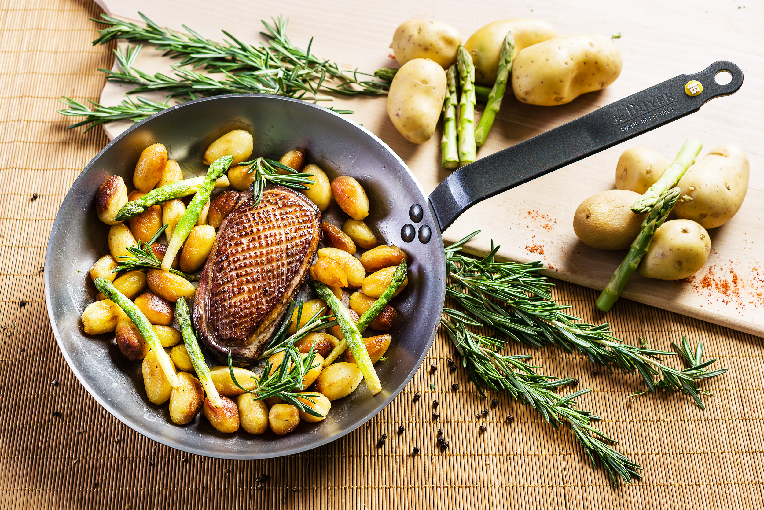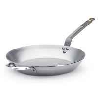 de Buyers stålpanner har været produceret i den samme fabrik i Frankrig siden 1830. Stålpanden er den traditionelle franske stegepande, der kan tåle høj varme, og dens kant er relativt høj og afrundet for at man kan ryste den uden at maden falder ud. Håndtaget i støbejern er fladt, så man kan aflaste håndleddet ved at støtte håndtaget mod underarmen. Håndtaget bliver ikke varmt ved normal brug, men hvis pannen holdes varm over længere tid, skal man bruge en grydelap eller en håndtagsbeskytter.