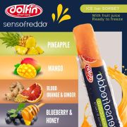 Dolfin Sensofreddo er en naturligt smagstilsat ispind med ægte frugtjuice og en blød sorbetkonsistens. Opbevar i spisekammeret og læg i fryseren et par timer inden servering – perfekt til varme dage, fester eller en hurtig frugtig bid.