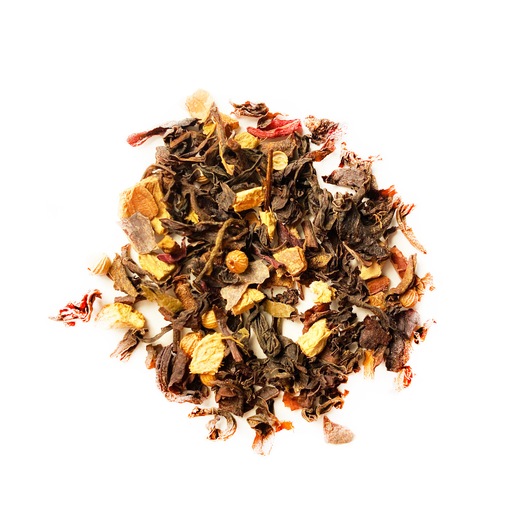 Sort te, kanelstykker, ingefær, knuste nelliker, koriander, kakaobønneskal, hibiscus, naturlig karamel-aroma, appelsinskal, brombærblade, appelsinolie, naturlig kakao-bittermandelaroma, naturlig kardemomme-aroma, knust kardemomme.