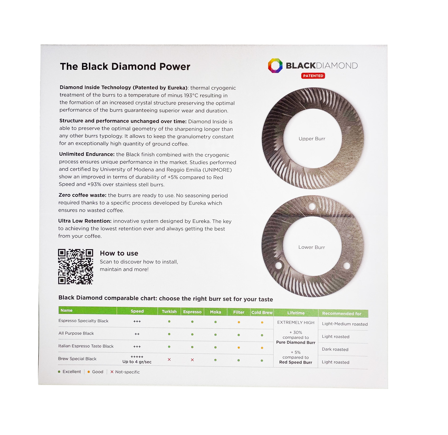 Den kryogene proces kombineret med DLC-black (Diamond Like Carbon) sikrer enestående ydeevne og levetid. Studier certificeret af Universiteterne i Modena og Reggio Emilia (UNIMORE) viser en forbedring af holdbarheden med +5 % sammenlignet med Red Speed og +93 % sammenlignet med kværnblade i rustfrit stål.