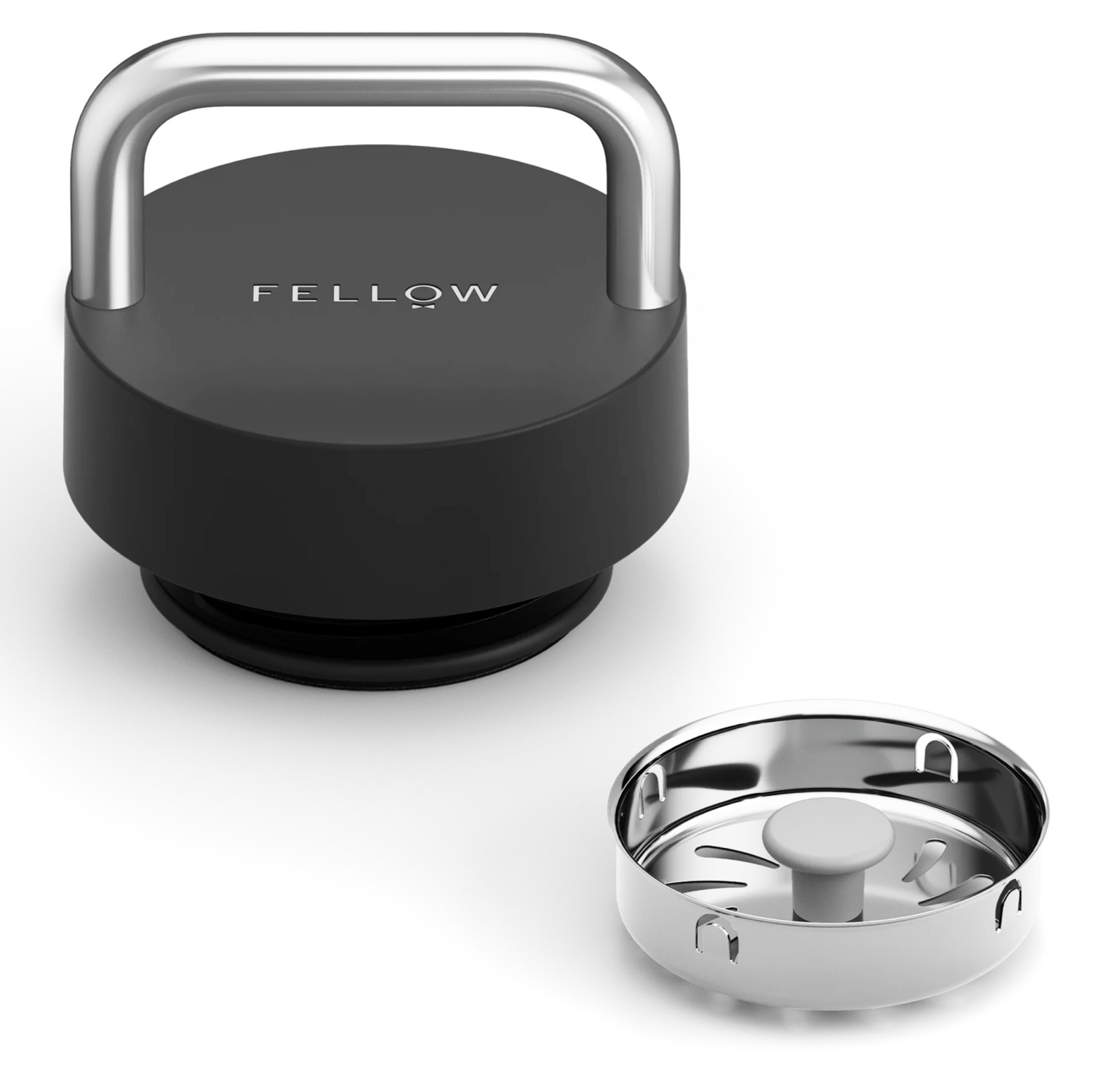 Det lækagesikre Fellow Carter Carry Lid-låg har et eksklusivt metalhåndtag og en stænkskærm, som nemt kan sættes på plads.