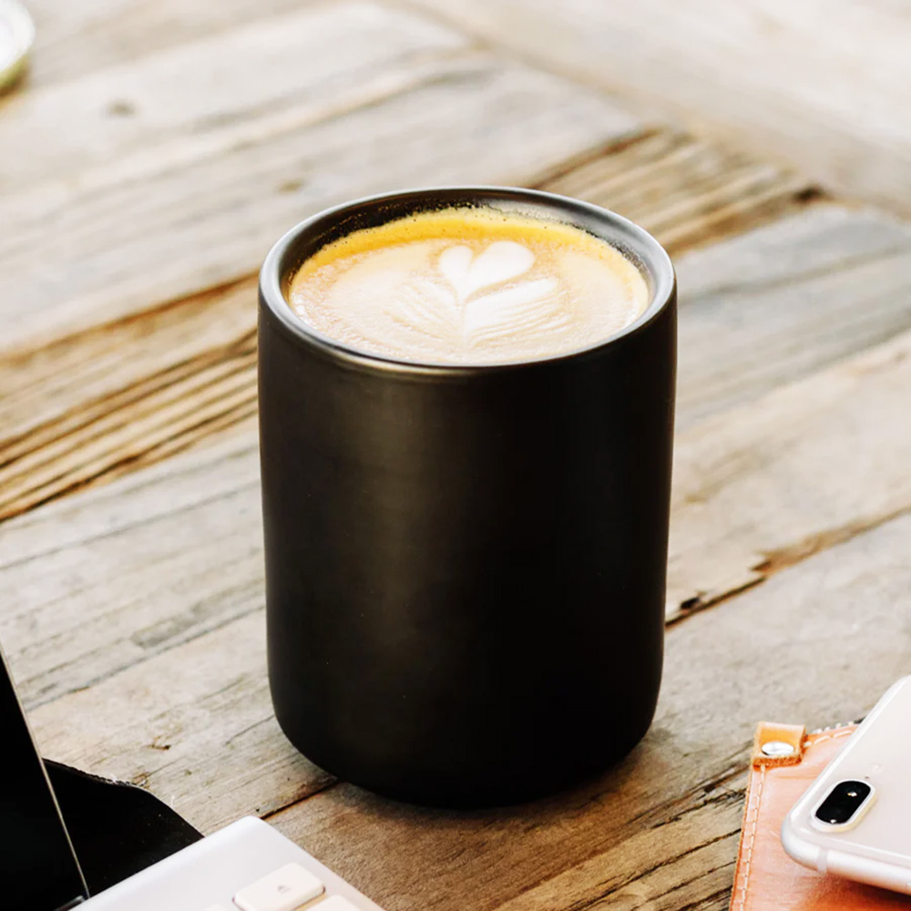 Den keramiske dobbeltvæggede Fellow Monty -lattekrus er perfekt til espresso-baserede kaffedrikke. Krusets konstruktion løfter cremaen op til overfladen og gør perfekt lattekunst mulig.