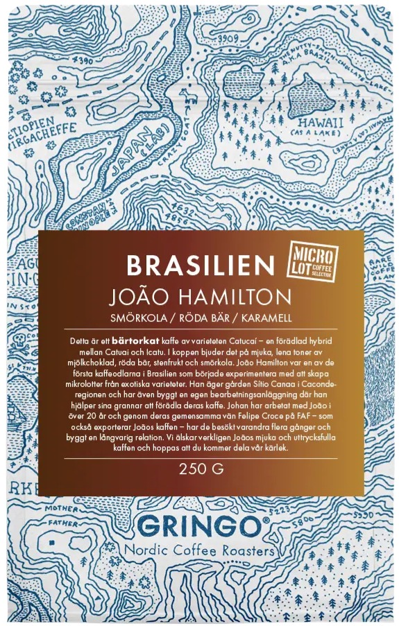Gringo Nordic Brasilien João Hamilton er en bærtørret specialkaffe fra Brasilien af varieteten Catucaí, en krydsning mellem Catuai og Icatu. Kaffen har en blød og glat smagsprofil med noter af mælkechokolade, røde bær, stenfrugt og smørkaramel.