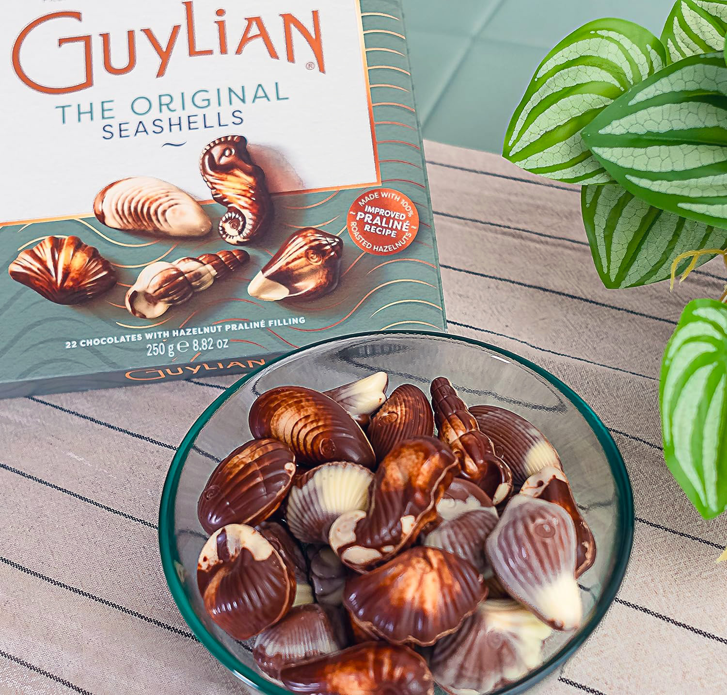 Guylian Seashells-praliner er chokoladeklassikere i unikke muslingeformer. Den fornyede opskrift smager nu mindre sødt. Disse belgiske praliner indeholder hvid, mælk og mørk chokolade samt hasselnøddefyld, og de er fremstillet af fairtrade råvarer.