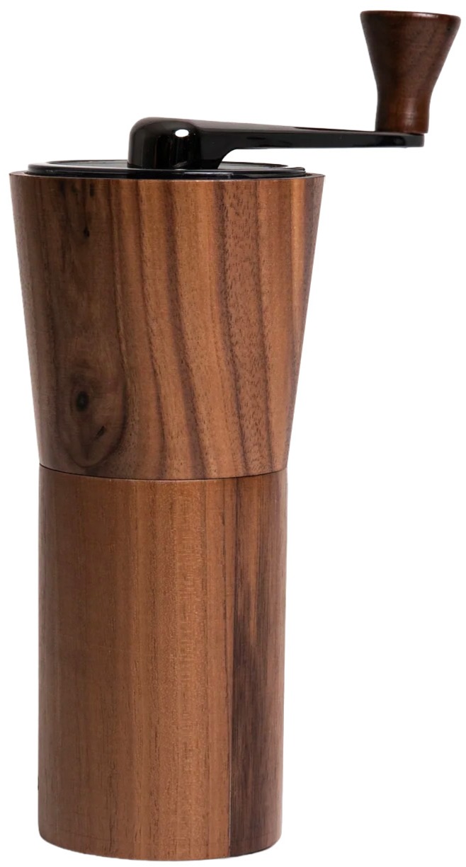Harios Walnut Wood kaffekværn i valnøddetræ har en høj, stilfuld form med matchende mørke beholdere, mens håndtaget i støbt aluminium giver både styrke og en elegant finish.
