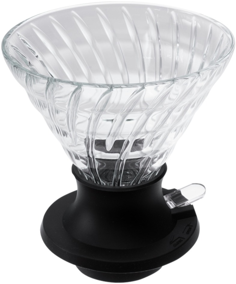 Hario Immersion Dripper Switch er en kaffemaskine i glas med en ventil i bunden. Filterholderen er af Harios sædvanlige V60-model, og den bruger filterpapir i størrelse 03. Ventilen i bunden holder vandet inde i filterholderen, mens kaffen brygges.