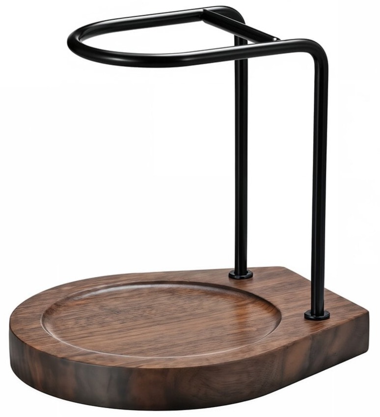 Stativet har en base i valnøddetræ, som tilfører varme og elegance til din bryggestation. Den robuste ramme i rustfrit stål giver en stabil støtte.