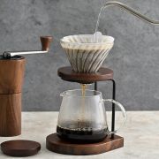 Hario V60 Drip Stand i valnøddetræ er et stilfuldt og praktisk supplement til din pour-over kaffestation. Den kombinerer naturlig elegance med stabil støtte for en præcis og harmonisk bryggeoplevelse.