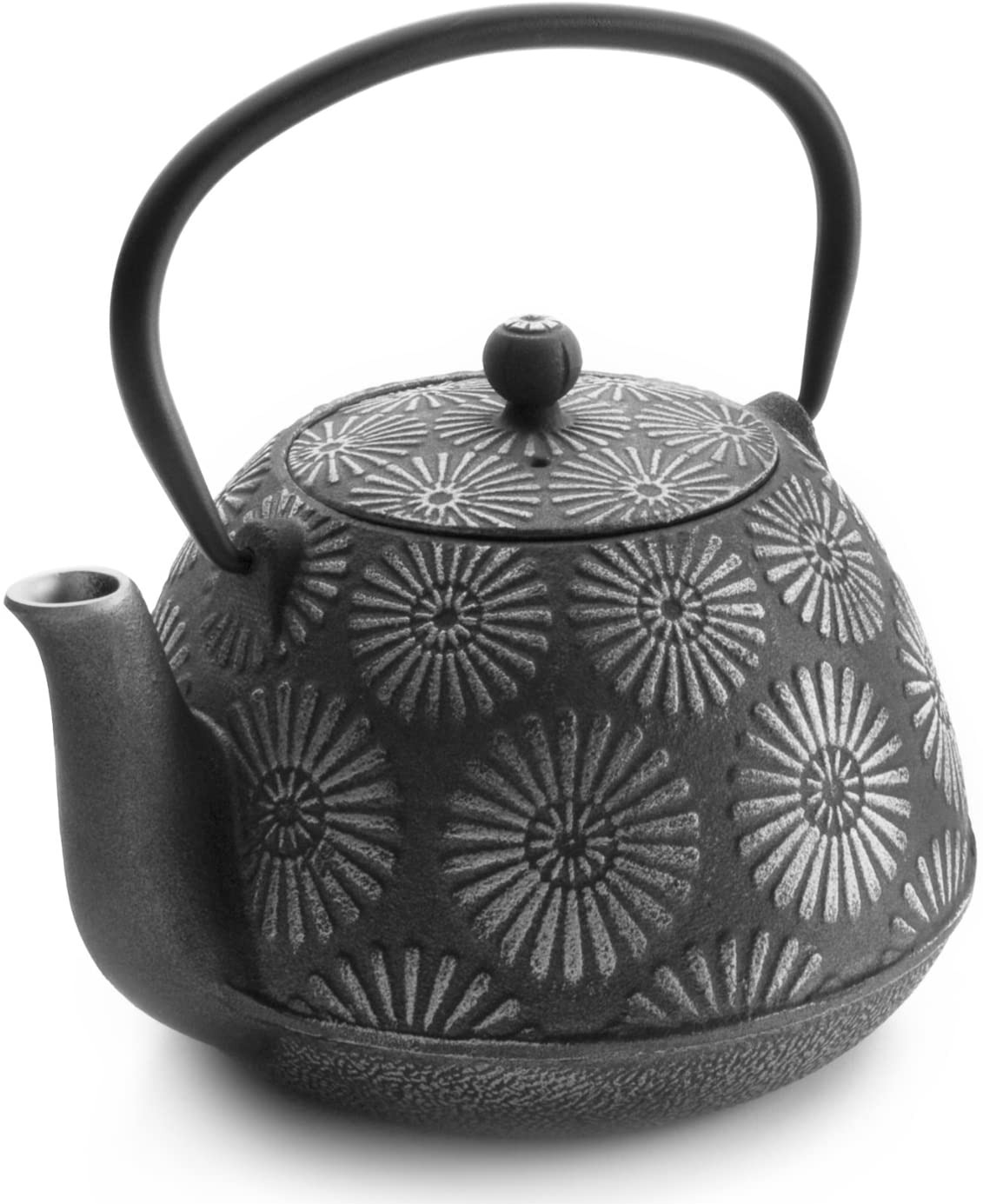 Smuk 1,2 liters Ibili-tepotte i støbejern med emaljeret inderside. En aftagelig rustfri te-si i rustfrit stål er inkluderet. Tepotten kan bruges på alle typer kogeplader. Støbejernsgryden holder teen varm længere end tepotter i keramik eller glas.