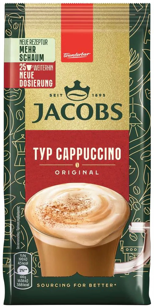 Nyd en cremet og blød cappuccino med Jacobs Cappuccino instant kaffepulver. En mild kaffe med et let, skummende mælkeskum – klar på blot få sekunder. Tilsæt varmt vand og rør rundt.
