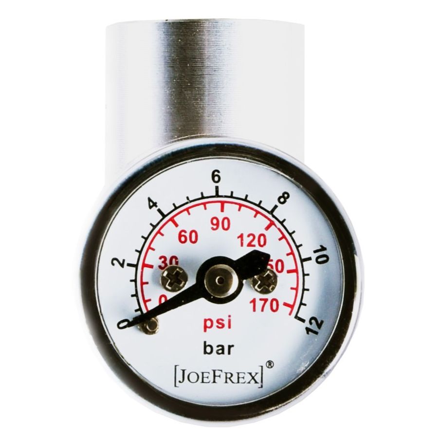 Denne JoeFrex miniature trykmåler kan bruges til at kontrollere pumpepresset i din espressomaskine. Ved at kende trykket kan du justere pumpen for at opnå 9 bars pumpepressure.