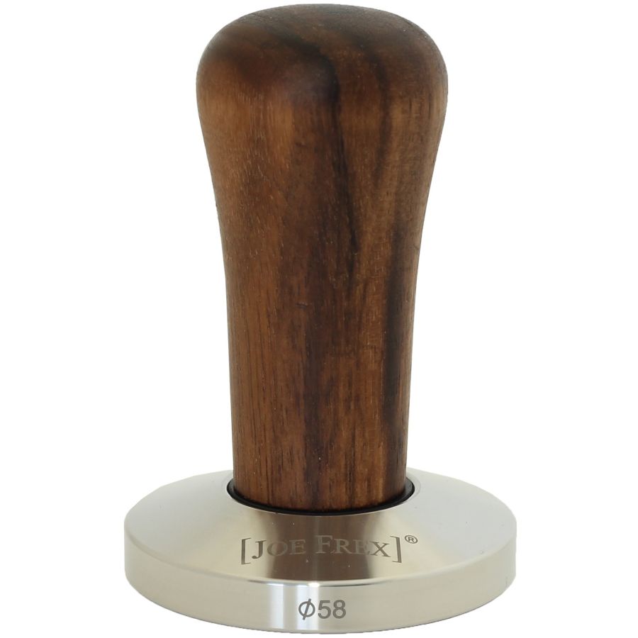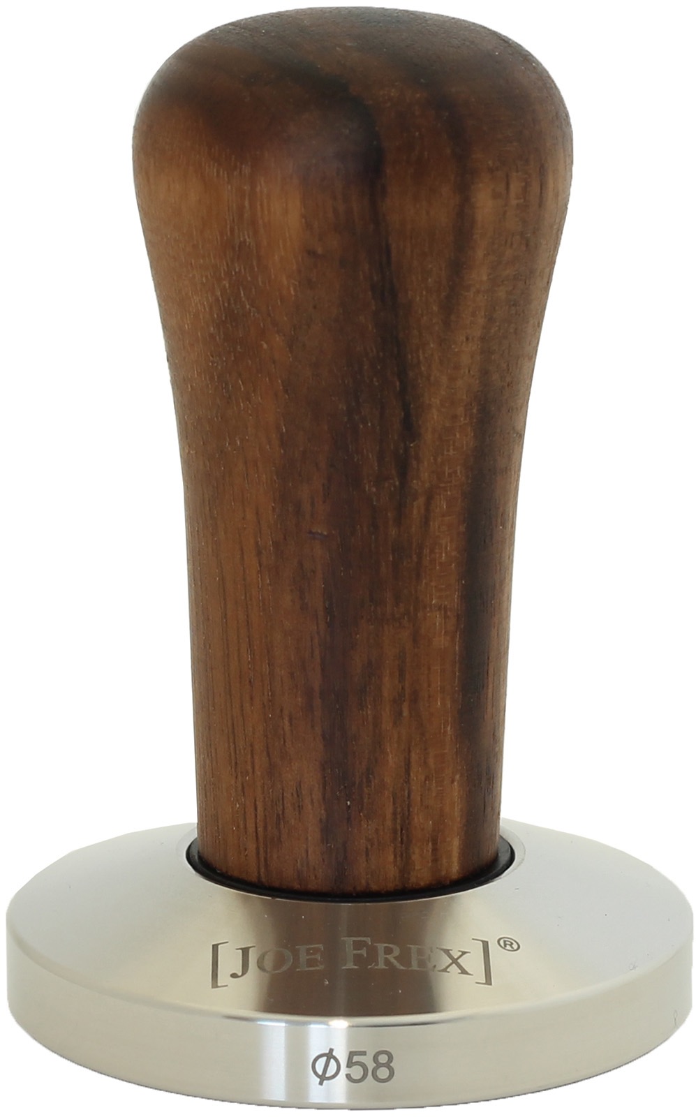 JoeFrex tamper med en flad bund af rustfrit stål og et klassisk valnødshåndtag. JoeFrex tamperen er håndlavet og ergonomisk designet for et perfekt greb og manuel kontrol.