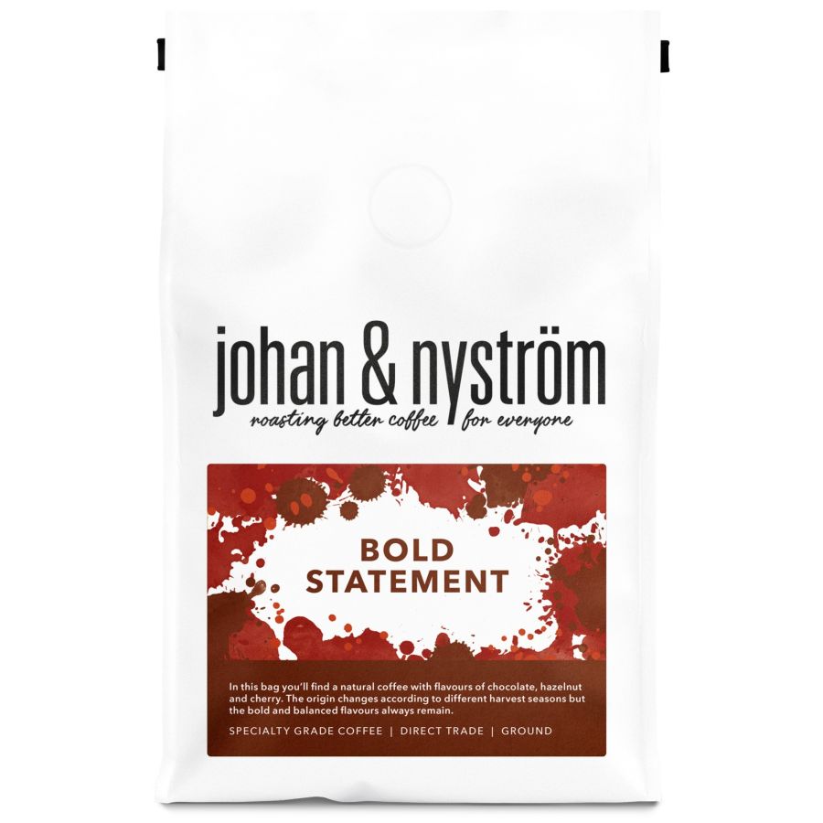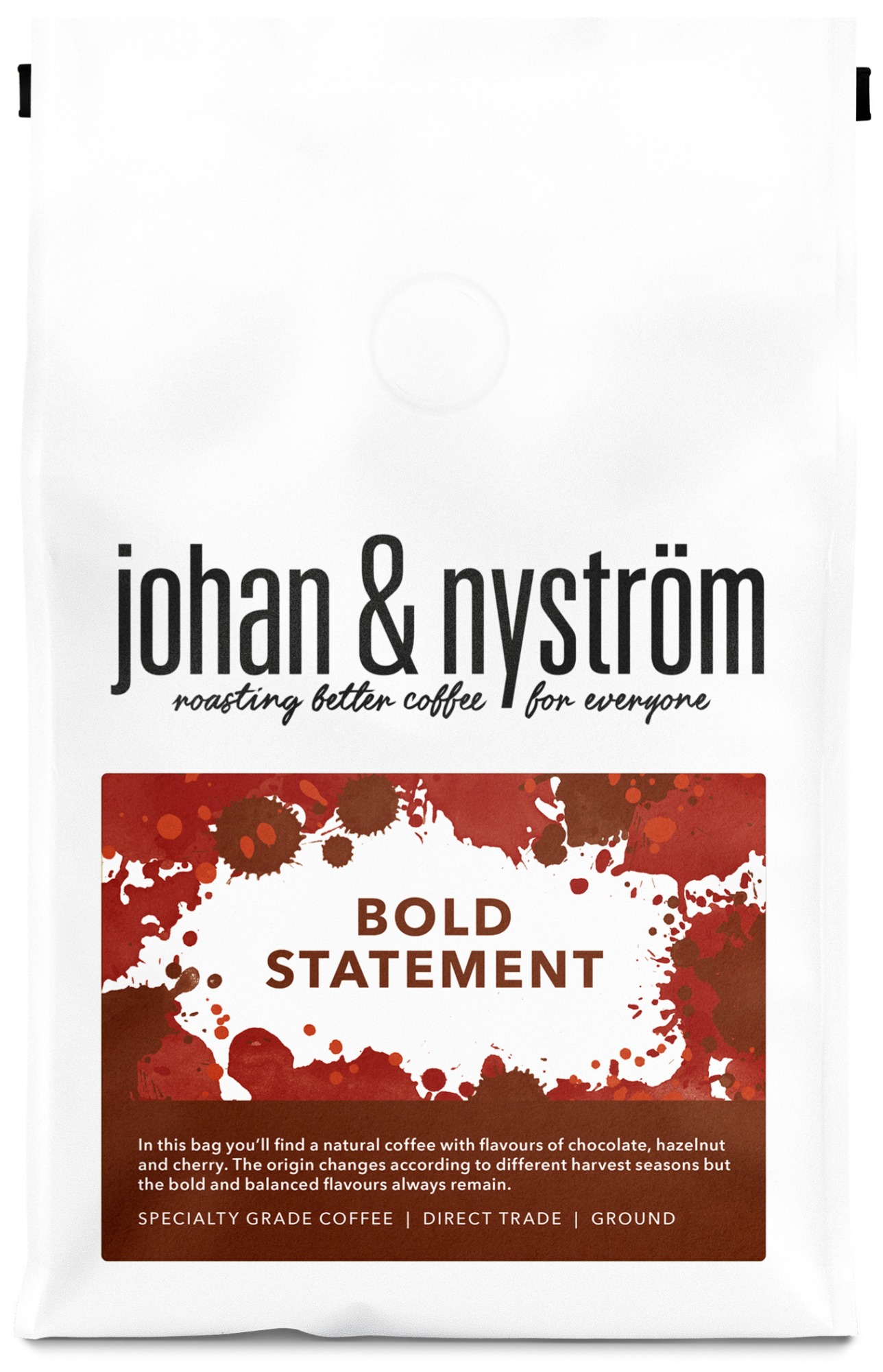 Johan & Nyström Bold Statement er et bærtørret kaffe med kraftige smag af chokolade, hasselnødder og kirsebær.
