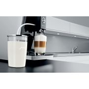 En elegant mælkebeholder i glas med låg i rustfrit stål. Jura-kaffemaskinen tager mælken direkte fra beholderen og skummer den i din kop. Beholderen kan vaskes i opvaskemaskine.