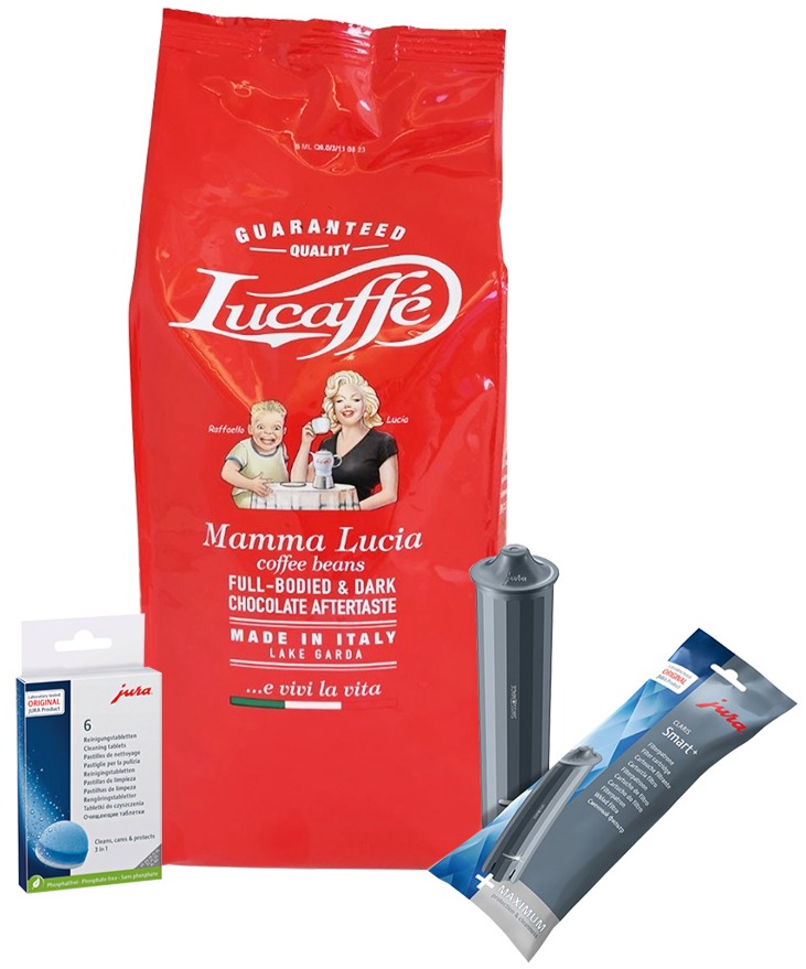 Jura Claris Smart+ vandfilter + rengøringstabletter 6 stk. + Lucaffé Mamma Lucia 1 kg kaffebønner