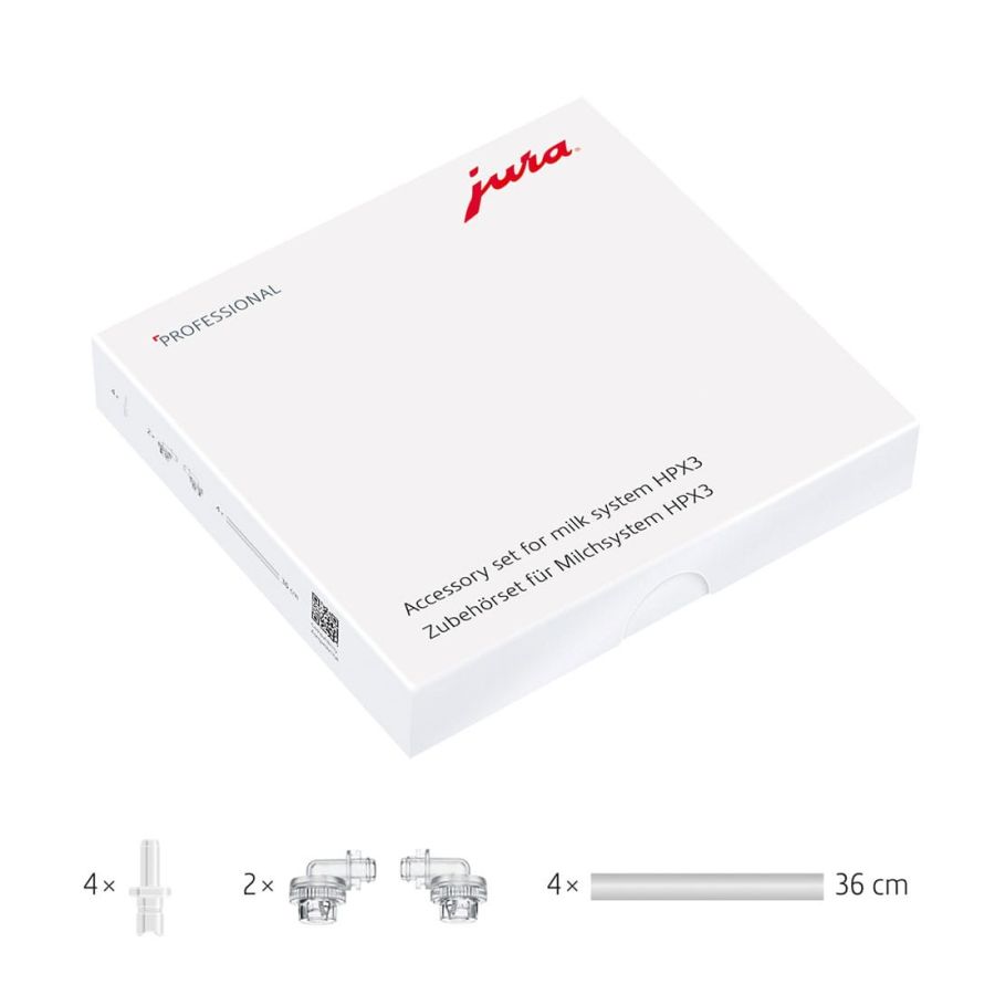 HPX3-sættet passer til alle JURA Professionelle kaffemaskiner i X- og GIGA X-serierne, som bruger mælkesystemet HP3 og mælkeudløb fra CX2-systemet. Det består af mælkeslanger, tilslutninger og indsugningsrør.