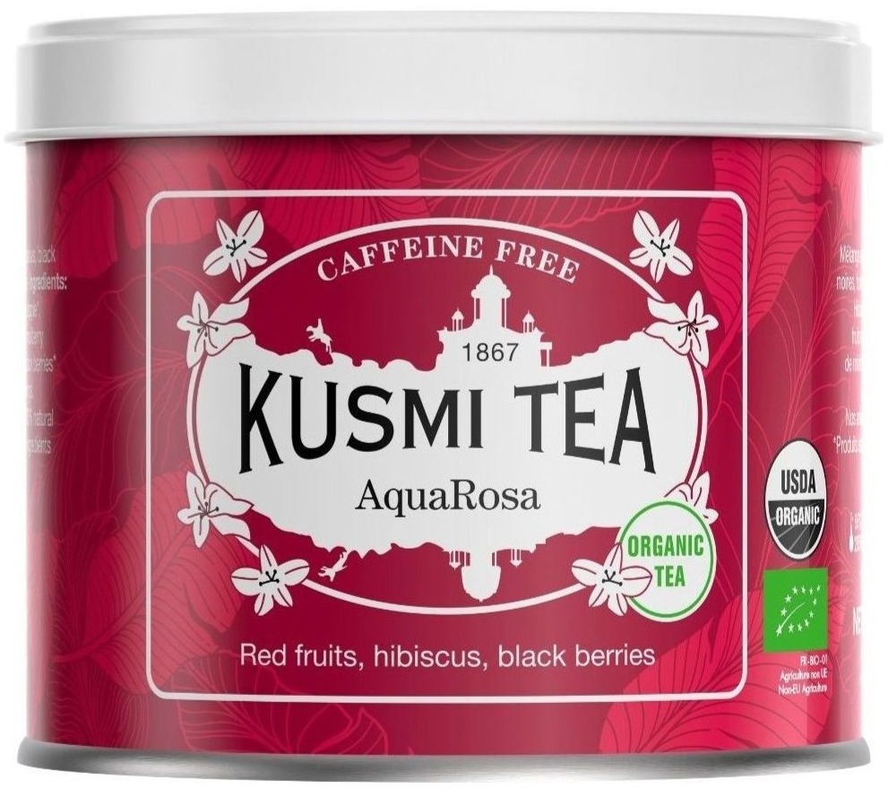 Kusmi AquaRosa er en økologisk frugt- og urtete-blanding med en blød og bæragtig smagsprofil og er naturligt koffeinfri.