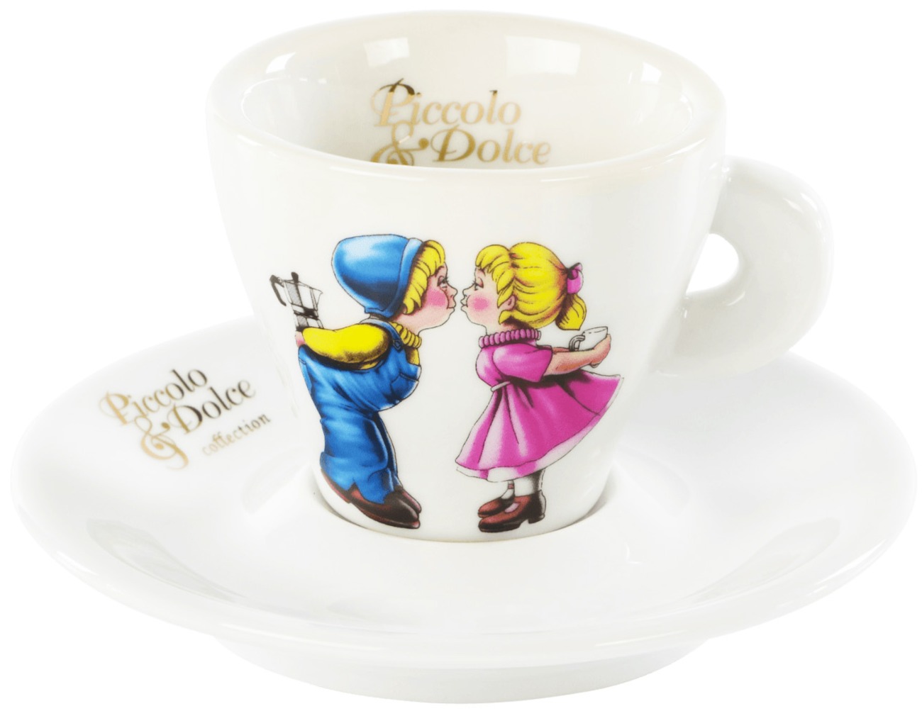 Espressokoppen fra Lucaffé imponerer med sit berømte Piccolo & Dolce-par. På indersiden af koppen og på tallerkenen er Piccolo & Dolce trykt med sølvbogstaver. Tykt italiensk porcelæn.
