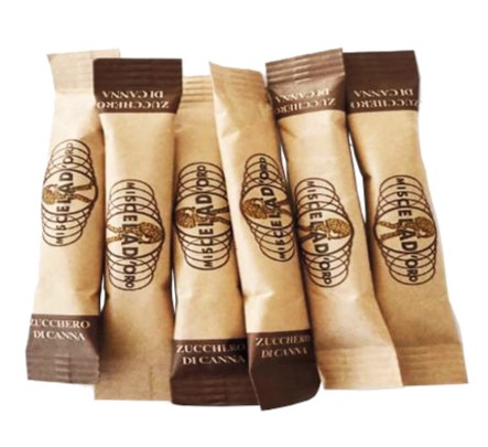 Brun fint sukker fra det italienske kafferisteri Miscela d'Oro i praktiske 4 grams portionspakninger. 1000 sukkerpakninger i en kasse.