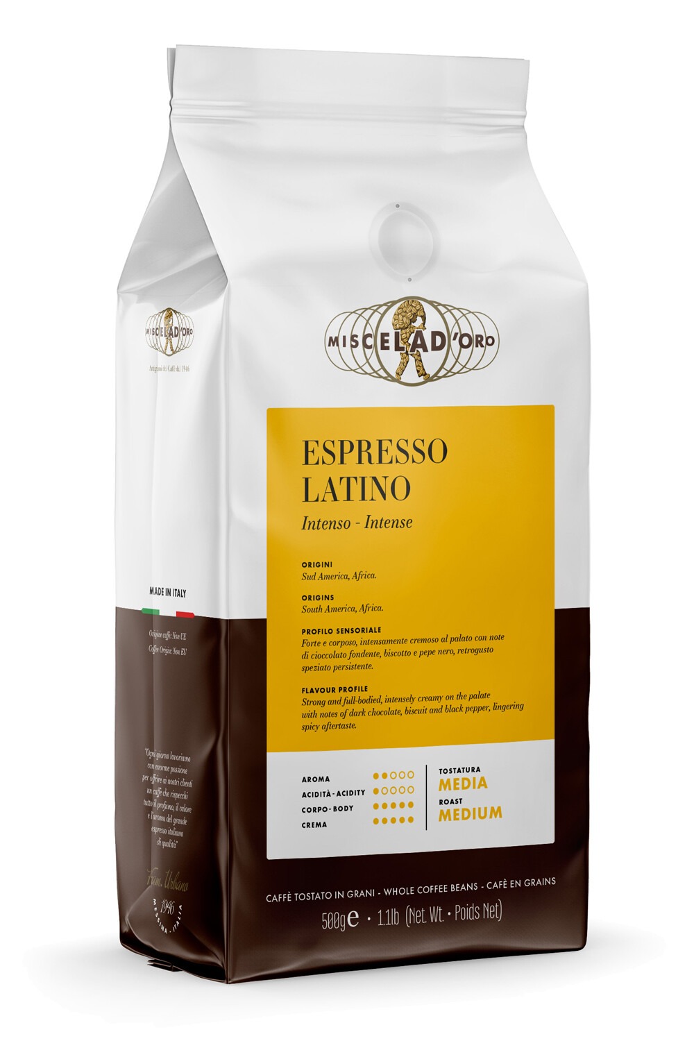 Miscela d'Oro Latino er den traditionelle italienske espresso med en fyldig mundfuld og en tyk crema. Espressoen består af en velafbalanceret Arabica- og Robusta-blanding fra Sydamerika og Afrika.