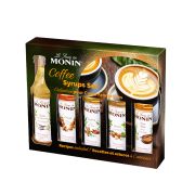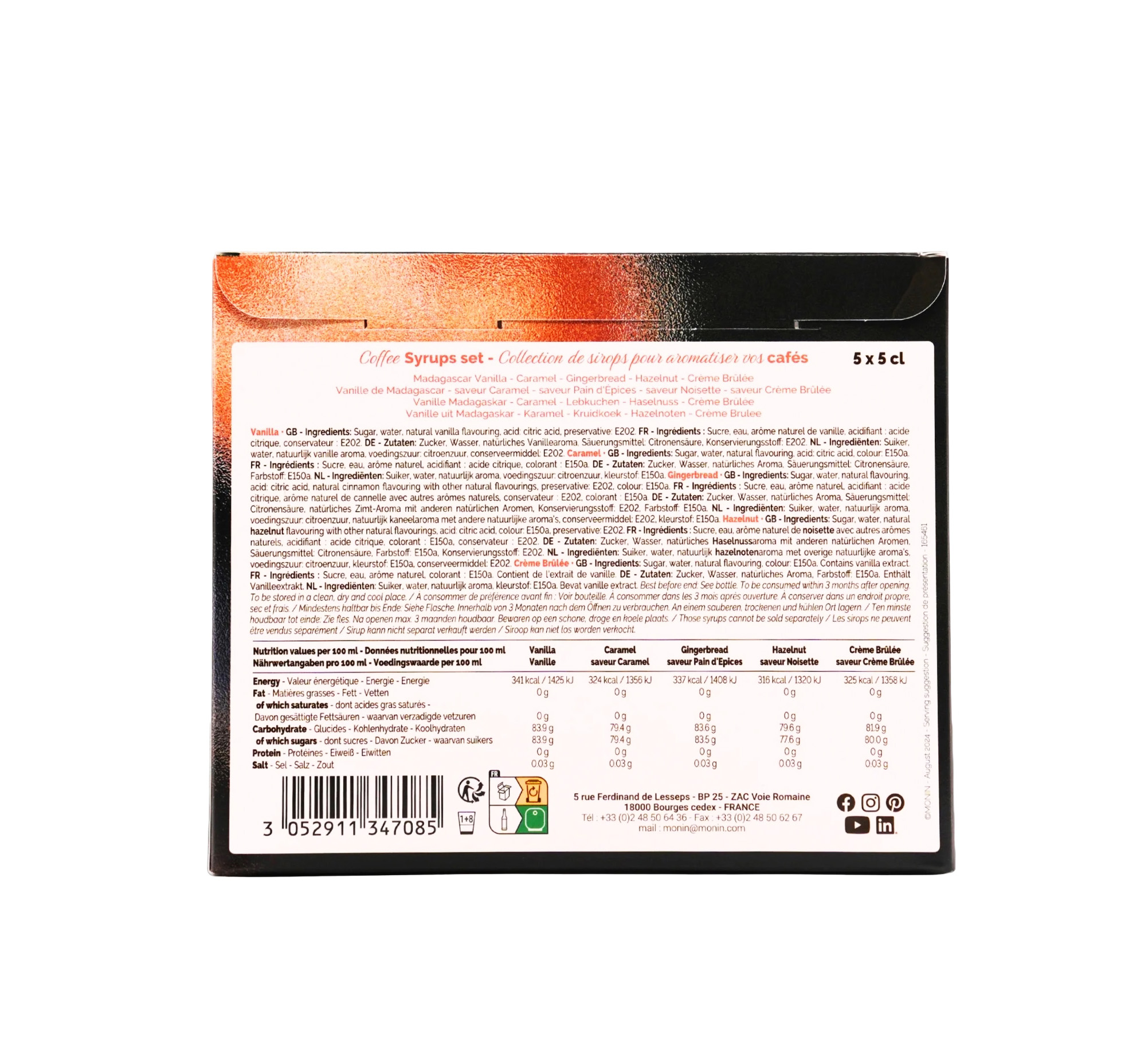 Monin Caramel: Sukker, vand, aroma, syre: citronsyre, farvestof: E150a. Monin Vanilla: Sukker, vand, naturlig vaniljearoma, syre: citronsyre, konserveringsmiddel: E202. Monin Hazelnut: Sukker, vand, aroma, koncentreret citronsaft, konserveringsmiddel: E202, farvestof: E150b. Indeholder hasselnøddeekstrakt. Monin Gingerbread: Sukker, vand, aroma, syre: citronsyre, naturlig kanelaroma, farvestof: E150a, konserveringsmiddel: E202. Monin Crème Brûlée: Sukker, vand, naturlig aroma, farvestof: E150a. Indeholder vaniljeekstrakt.