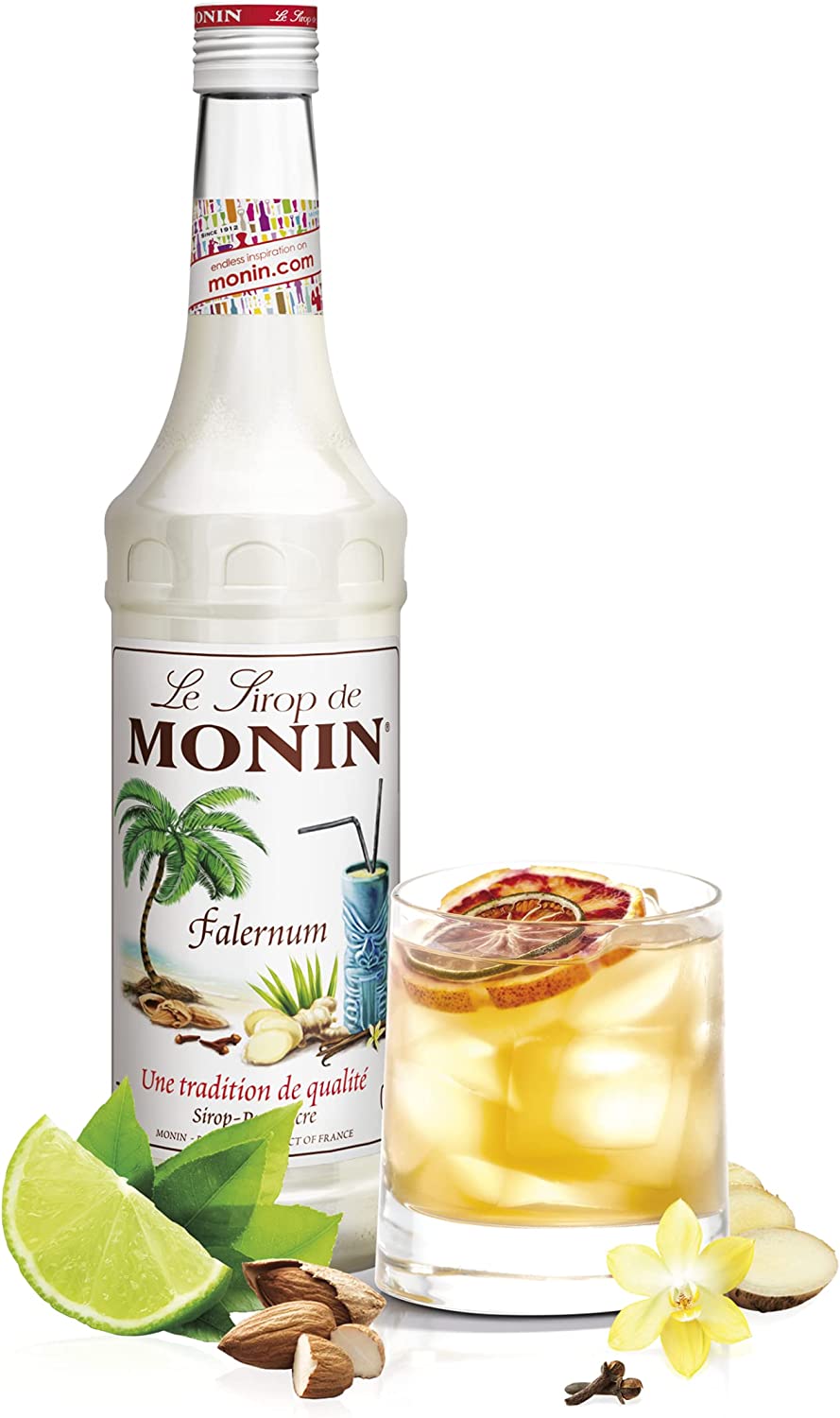 MONIN Falernum smagsirup med en sofistikeret blanding af krydderier kombineret med limesyre og en blød smag af mandel, en essentiel ingrediens i Tiki-cocktails!