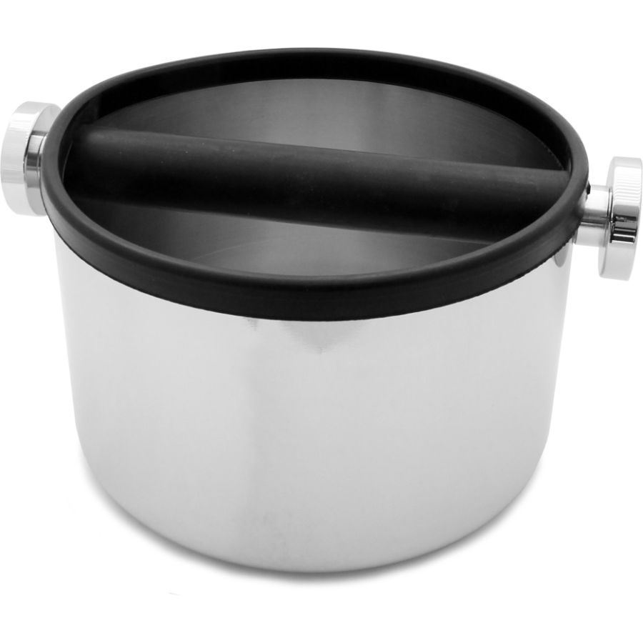 En robust knockbox med en diameter på 16,5 cm. Slå kaffebriksen fra espressomaskinens filterholder direkte ned i beholderen. Kanten på beholderen har en gummi krave, der beskytter filterholderen. I bunden af beholderen er der en 2mm tyk skumgummiskive, som dæmper slaget og forhindrer knockboxen i at glide på bordet. Stangen, som man slår filterholderen mod, er beskyttet med gummi, og den kan om nødvendigt fjernes ved at skrue knapperne på enden løs. Knockboxens højde er ca. 11,5 cm.