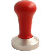 En solid tamper i rustfrit stål med et rødt træhåndtag. Bundet på tamperen er glat og lige. Øverst på tamperen er mærket Motta og tamperens størrelse i millimeter indgraveret.