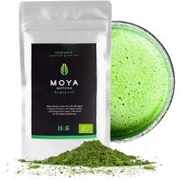 Moya Matcha Traditional får man fra den første og anden høst fra teplanter, der vokser i skygge fra direkte sollys. Dette resulterer i højere klorofylindhold og L-Theanin-indhold og en fyldigere, grønnere farve. De friske blade samles derefter op, tørres og males til pulver.