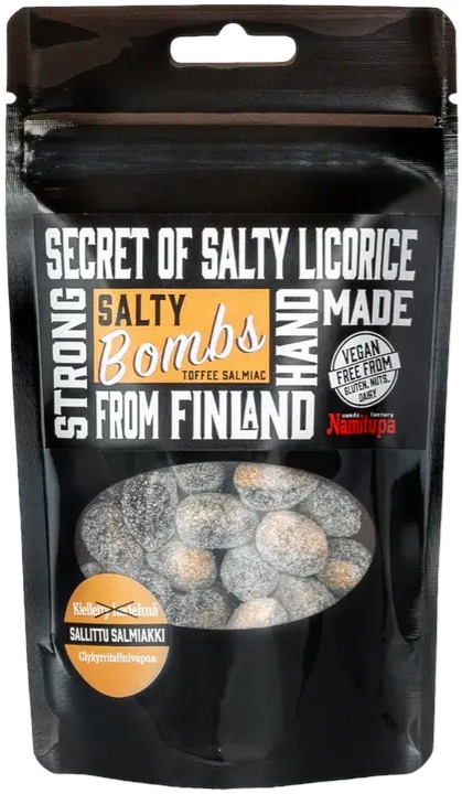 Namitupa Salty Bombs er en nyhed, der tager salmiakelskere til grænselandet mellem sødt og salt – og lidt over det også. Hvert stykke slik er en lille smagsrejse: Nogle gange leger den mildt fyldige karamell med smagsløgene, og straks derefter slår salmiakkens dybe, salte kick til. Sammen skaber disse to smagsverdener noget overraskende og afhængighedsskabende, en perfekt balance mellem sødme og salt.