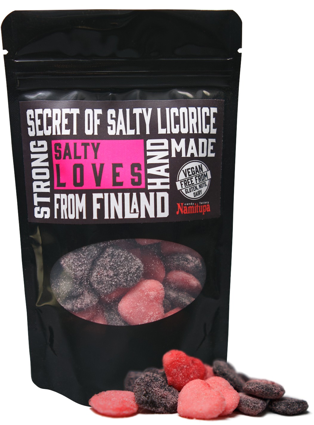 Salty Loves, Rakkaussalmiakki, Salta Kärlekar – elsket salmiak med mange navne. Denne supersucces, belønnet med Salmiakki Finlandia, byder på rigtig salt salmiak med lækre hindbærstriber. Smag og bliv forelsket!