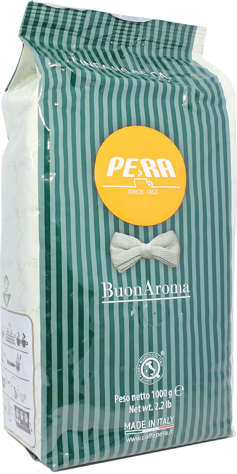 Denne espressokaffe er kendt for sin kraftige duft og bløde smag, med nuancer af ristet brød, krydderier, kakaobønner og frugt. Pera Buon Aromas eftersmag er ret lang og har klare nuancer af mørk chokolade.