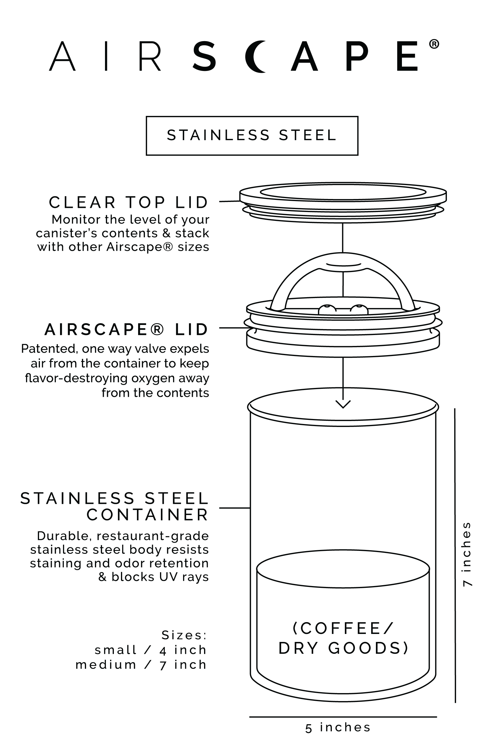 Den originale Planetary Design Airscape opbevaringsboks til kaffe og andre fødevarer. Låget fjerner luft og fugtighed og skaber en lufttom madopbevaring, der forlænger holdbarheden af kaffe, te, mel, sukker, korn, kager, frø, urter, nødder og andre følsomme fødevarer.